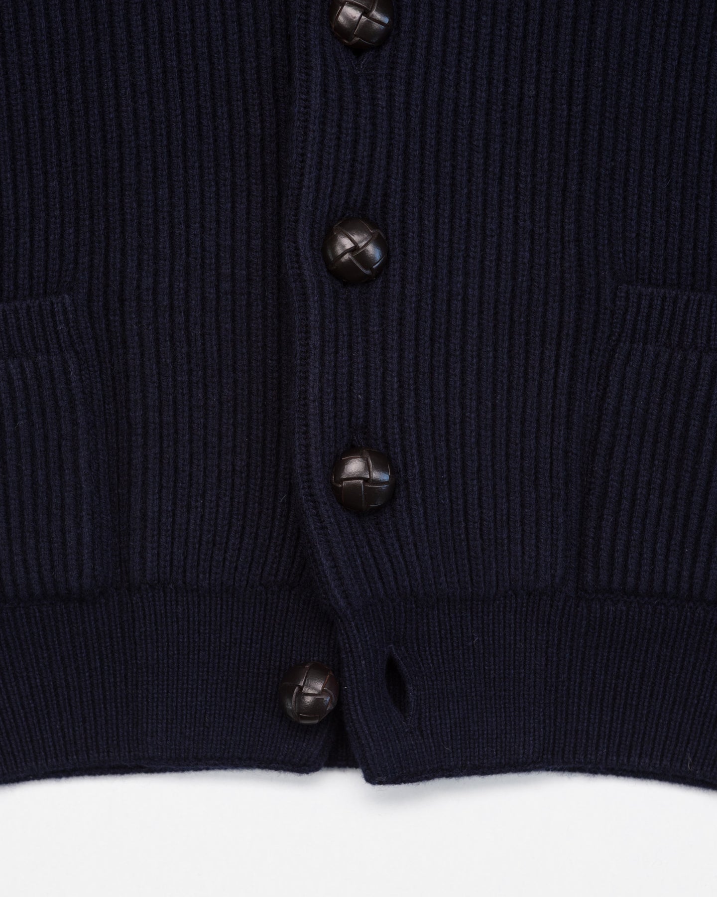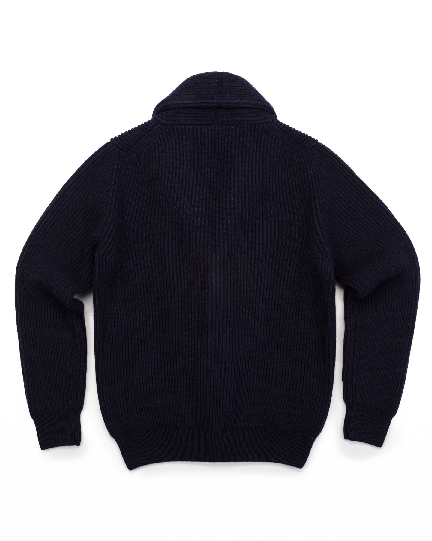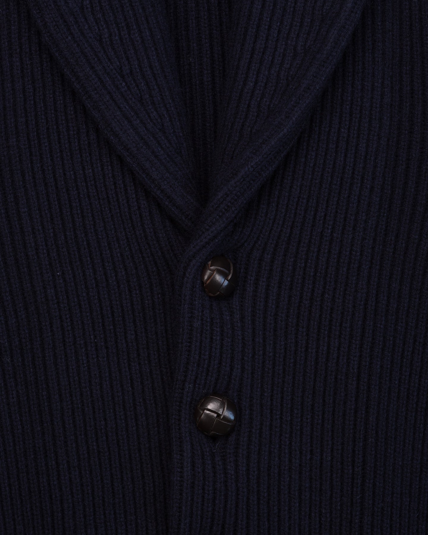 This cardigan is in our opinion, the pinnacle of fine knitwear. Made from a 7 gauge and 4 Ply wool and produced in an English Rib, this is a substantial piece of wool weighing in at just over 1.2kg, all put together with impeccable attention to detail.