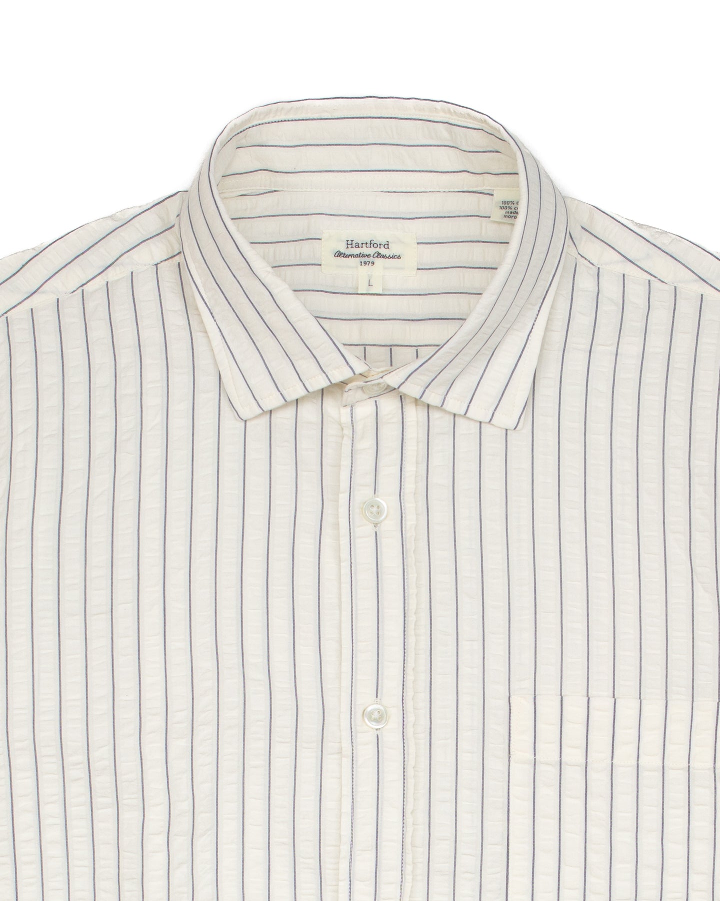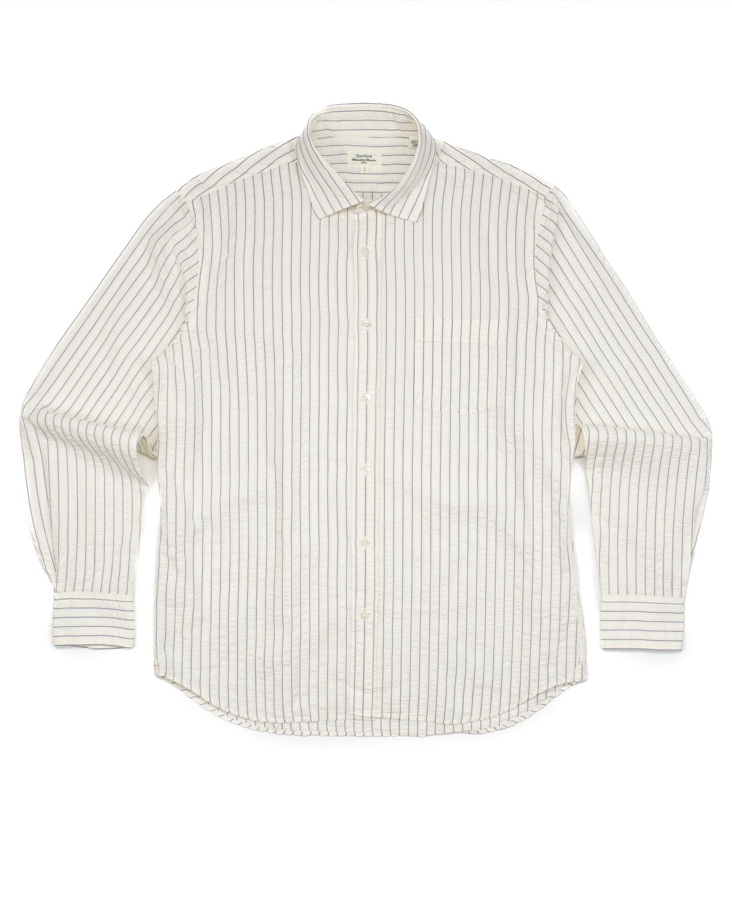 An off-white cotton shirt in a seersucker fabric gives this piece a feel of vintage elegance.
