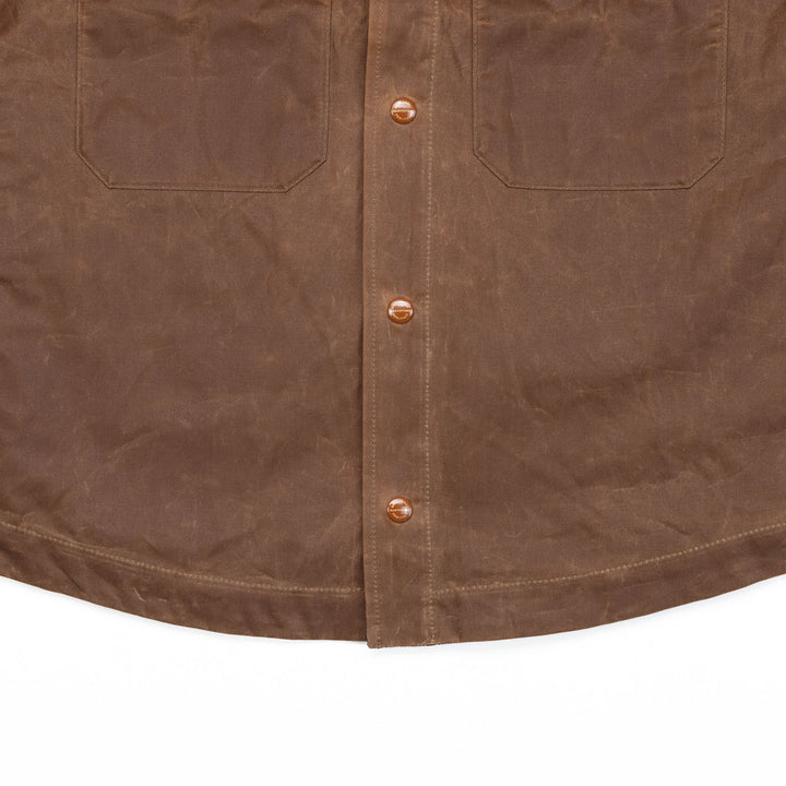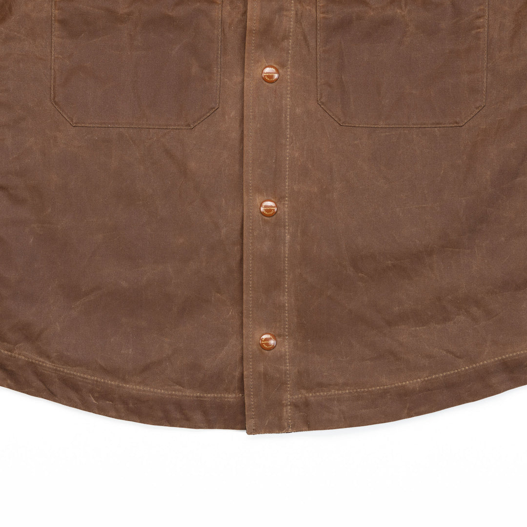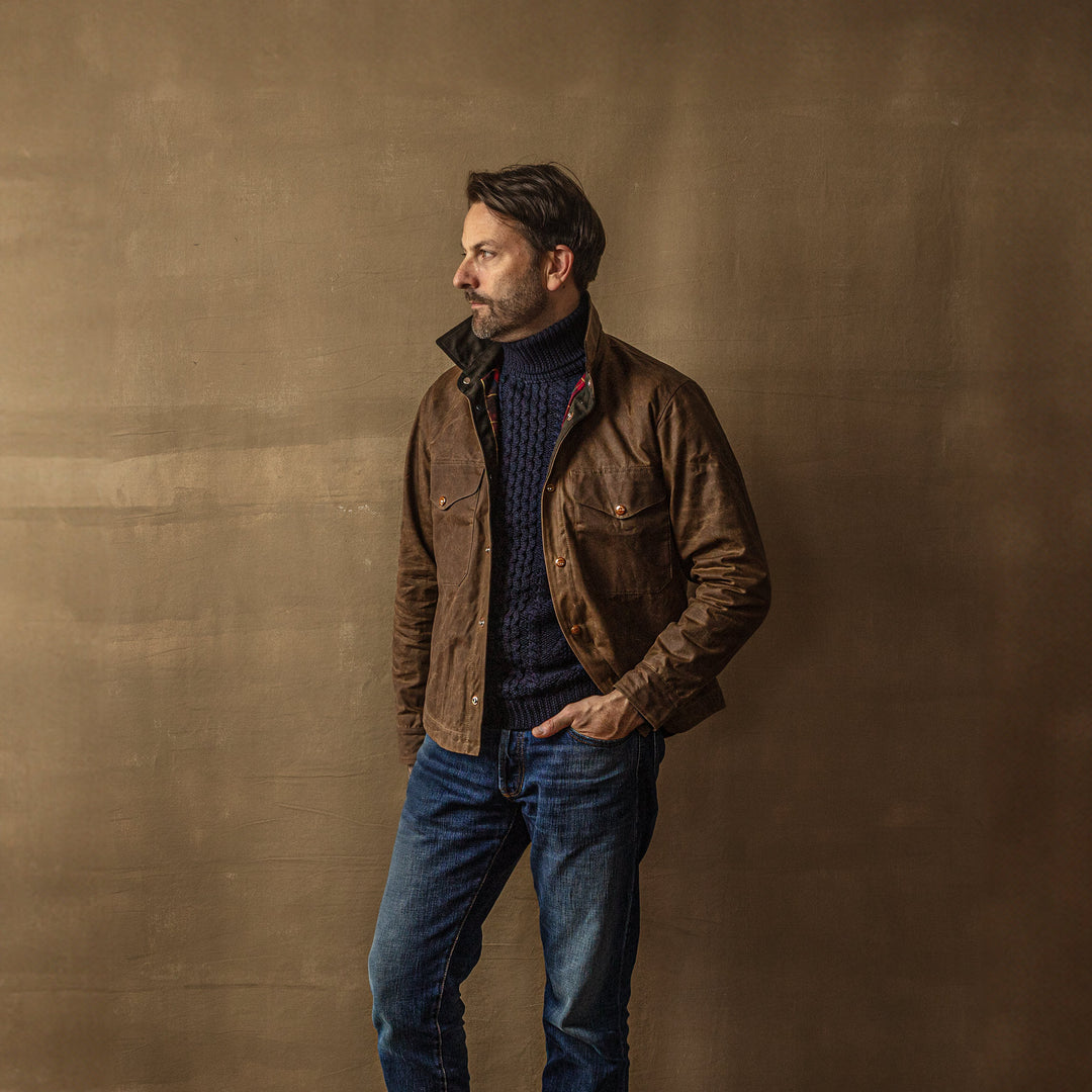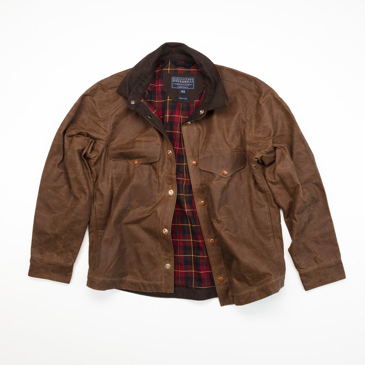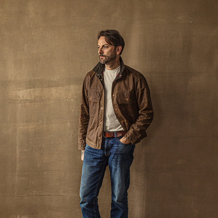 A magnificent looking shirt jacket made from a proprietary paraffin-coated waxed cotton. The jacket is of the highest quality, all made in Italy. The stitching is made with water repellent thread, making this a rugged outerwear piece that is also light enough to wear as an over-shirt.