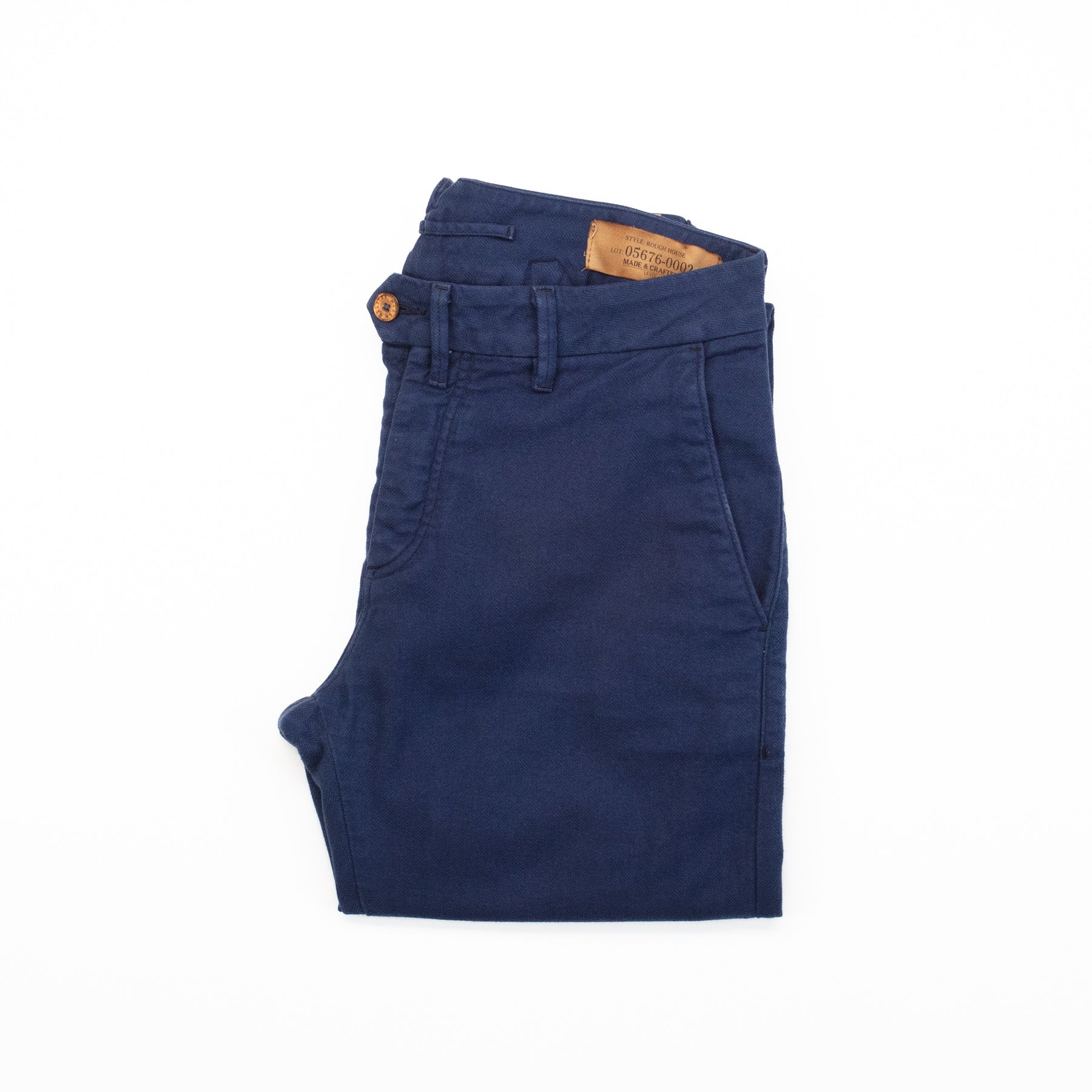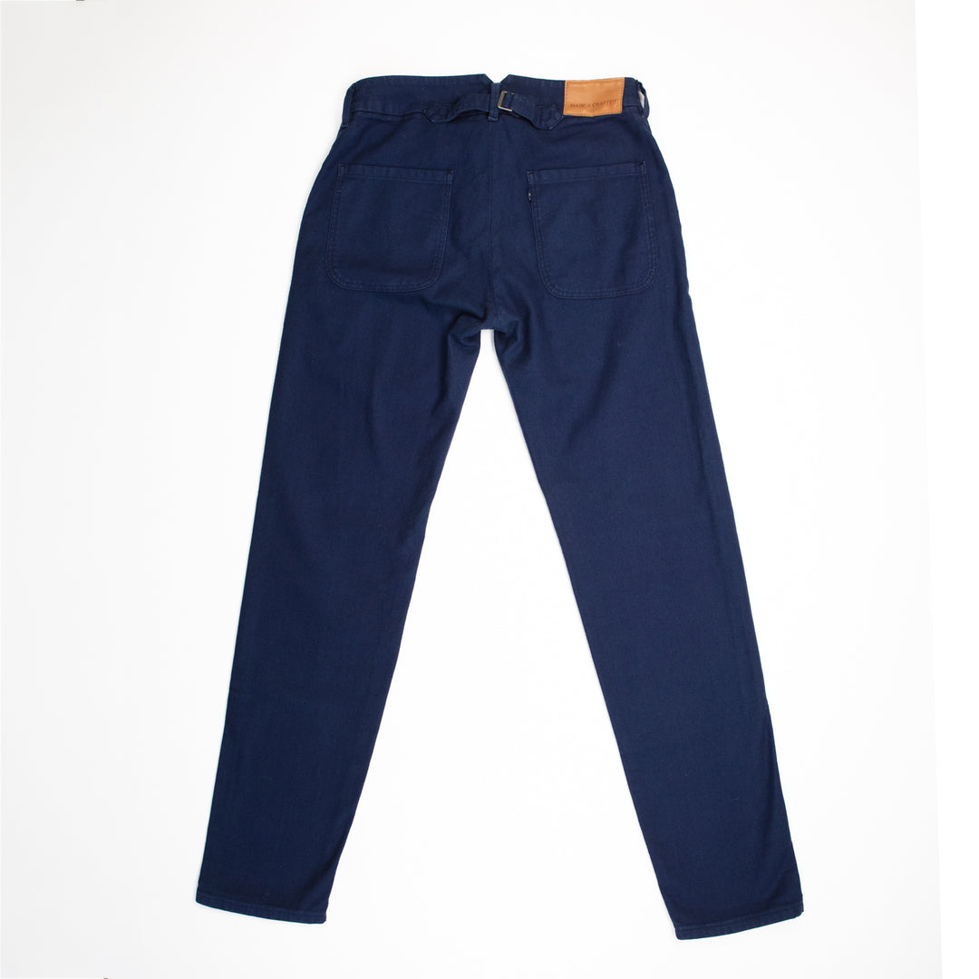 In good condition with careful wear, a pair of navy HBT chinos in a brushed flannel.