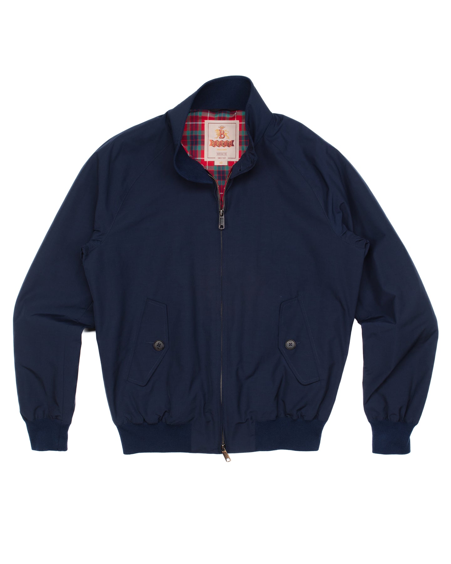 The original Baracuta G9 Harrington Jacket, handcrafted in the UK since 1937. This iconic navy piece features Fraser Tartan lining, breathable Coolmax® fabric, and a distinctive umbrella back yoke that sheds rain effortlessly. Classic two-button collar, deep pockets, and ribbed cuffs complete the timeless design. Versatile enough for any season or occasion, it's built to withstand unpredictable weather while maintaining heritage appeal.