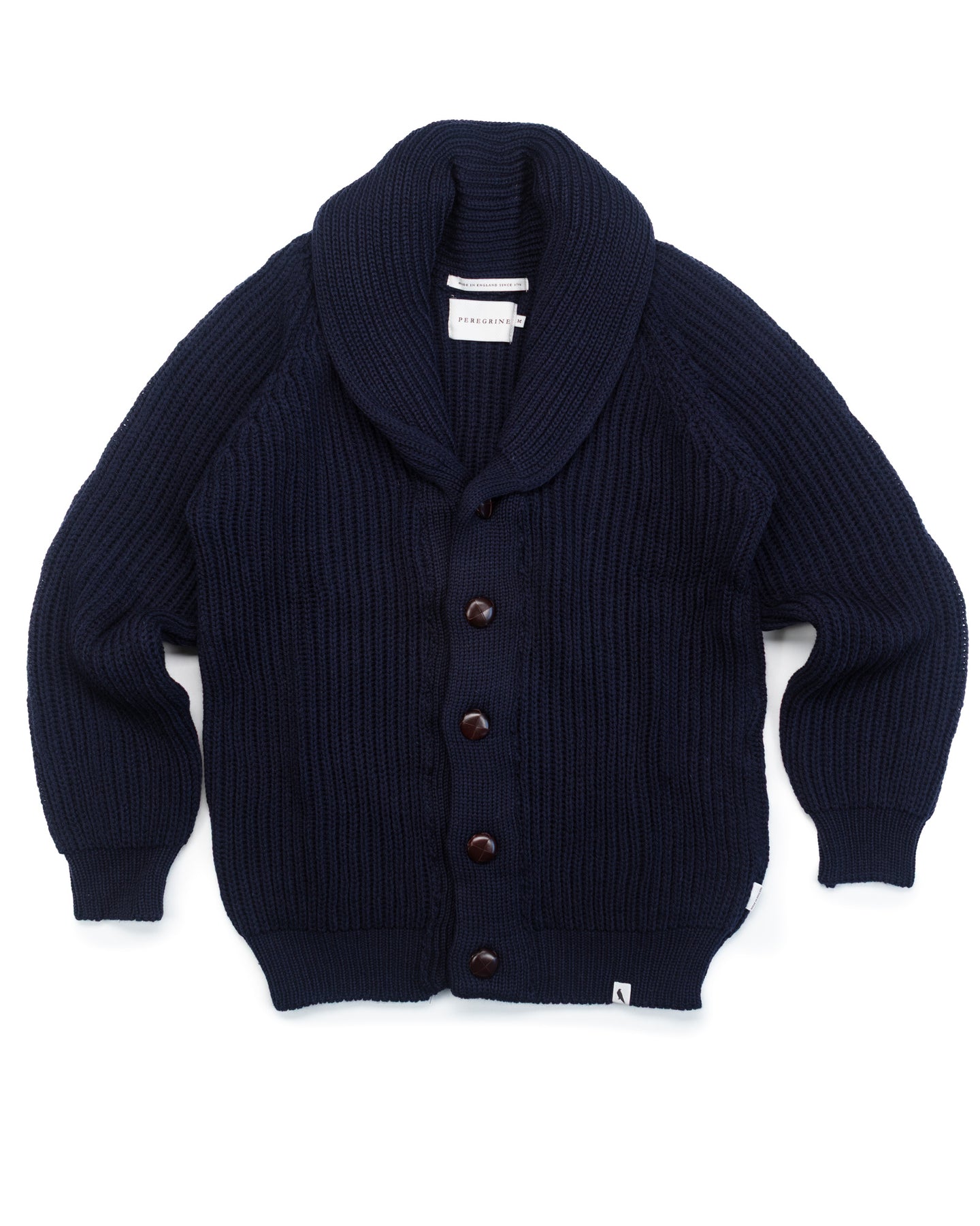 A 100% Merino wool ribbed cardigan in a chunky knit. This men's classic wardrobe staple is finished with signature button fastenings, a cosy shawl neck and raglan sleeve.