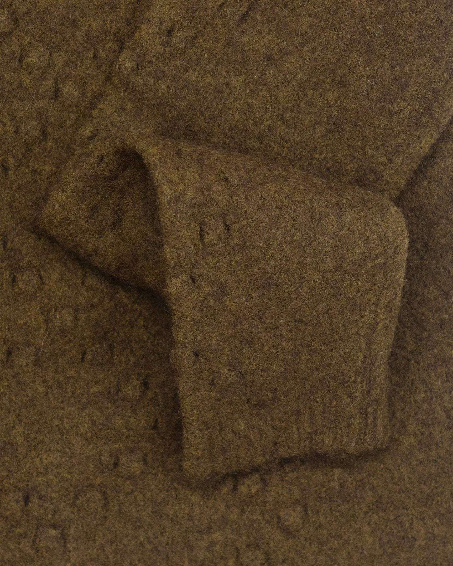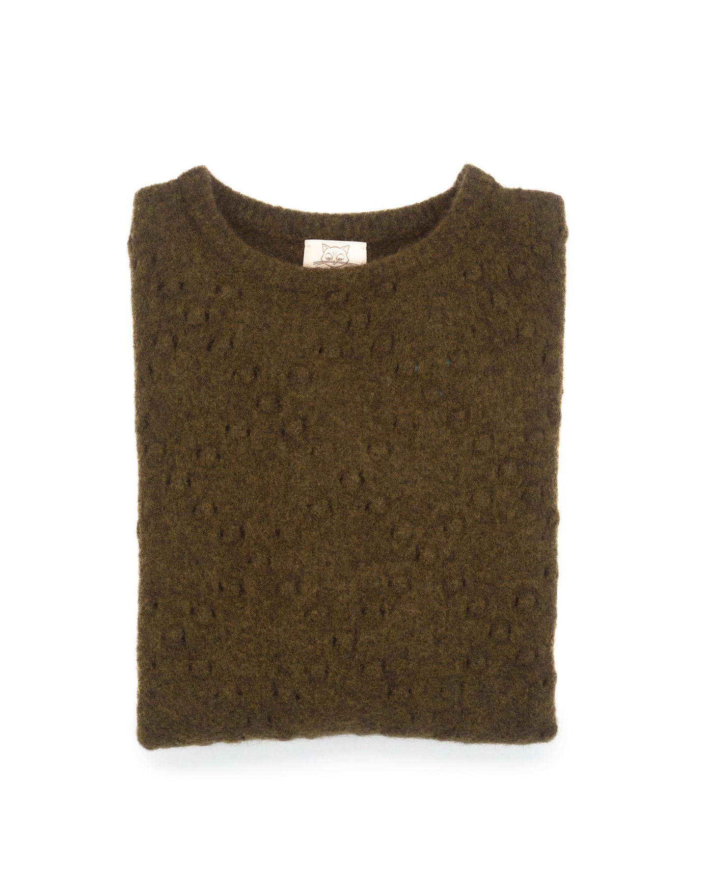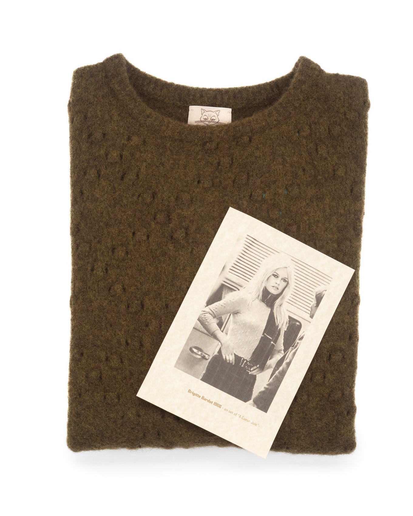 In 1966 Brigitte Bardot in 'A coeur Joie' wore a beautiful jumper that inspired this stunning Rakki Piece. A super soft blend of Baby Merino Wool and Yak in a noisette- peanut stitch on top of a faint geometrical diamond shape. It is a jumper that looks perfect with high waisted trousers or skirts. The merino wool insures it to be warm even if its weight allows it to be worn also under a blazer.