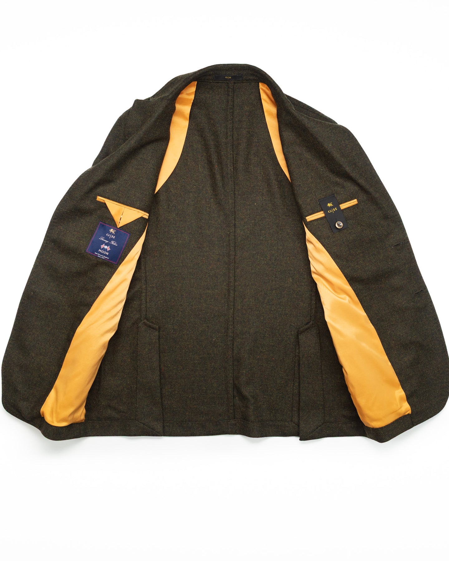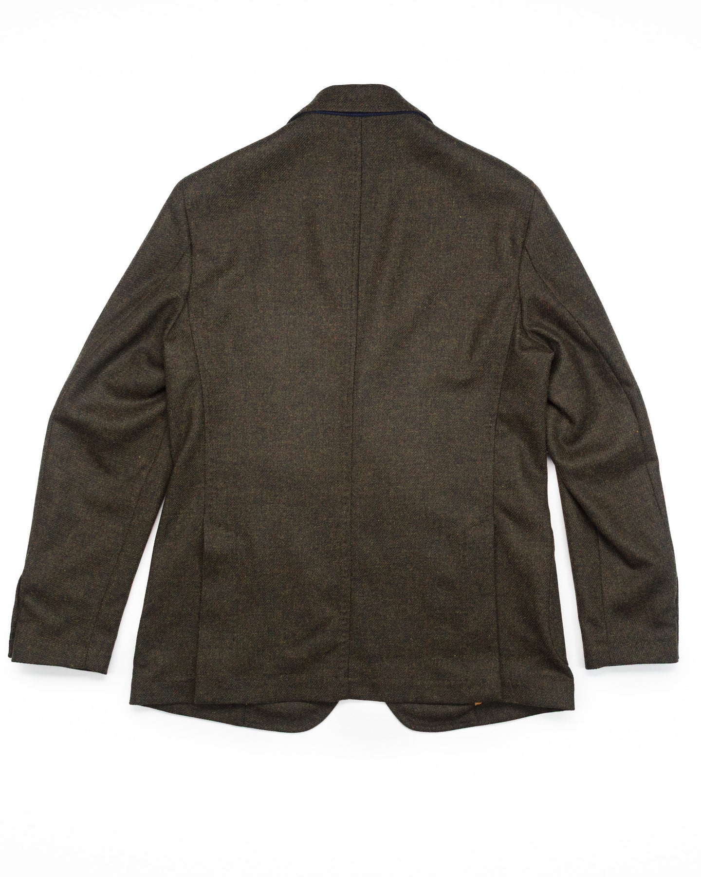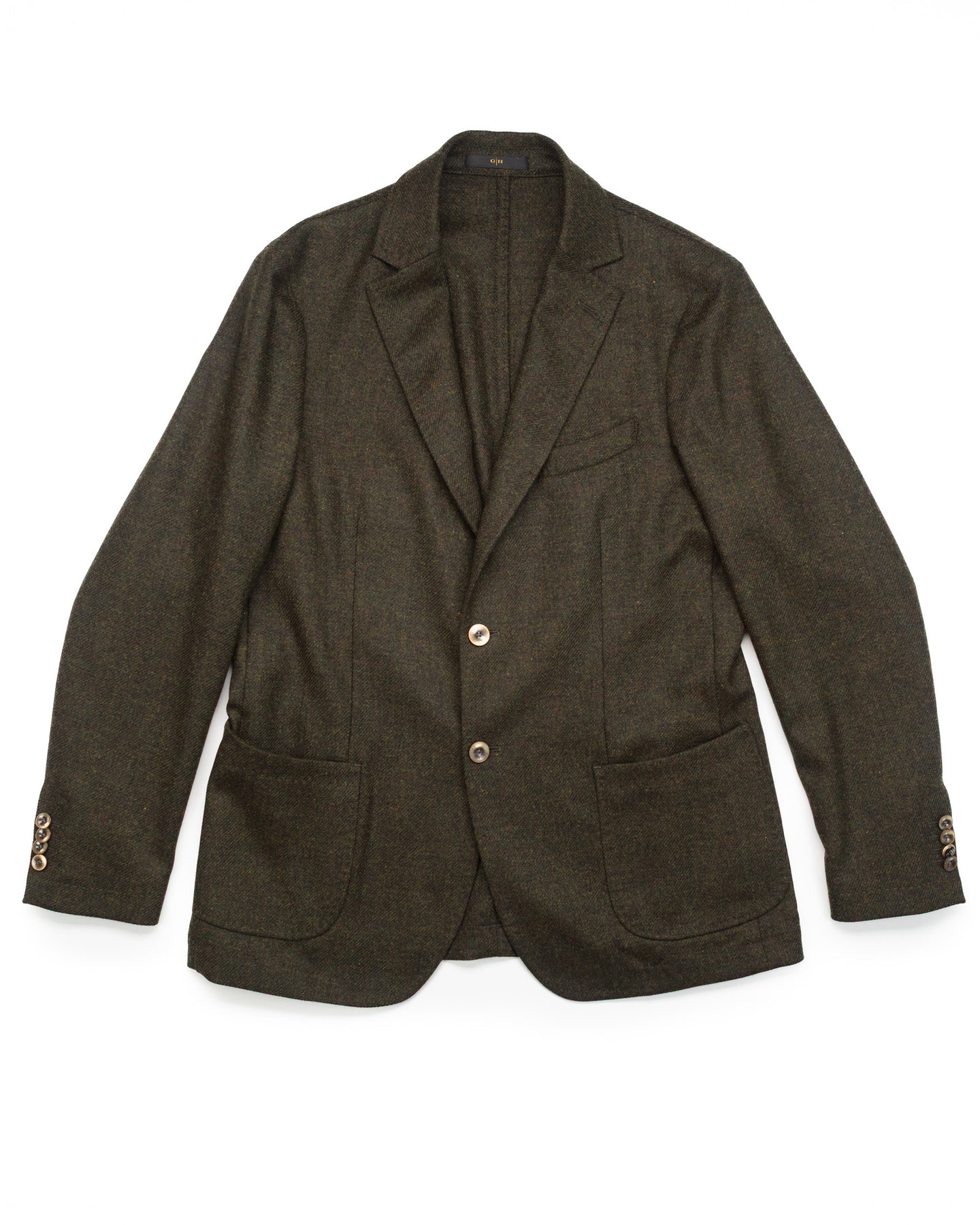 A single breasted blazer made from 100% Wool, sourced from the Moon Mills in England. Two buttons on the front, and open hop pockets, with twin vent pleats at the back.