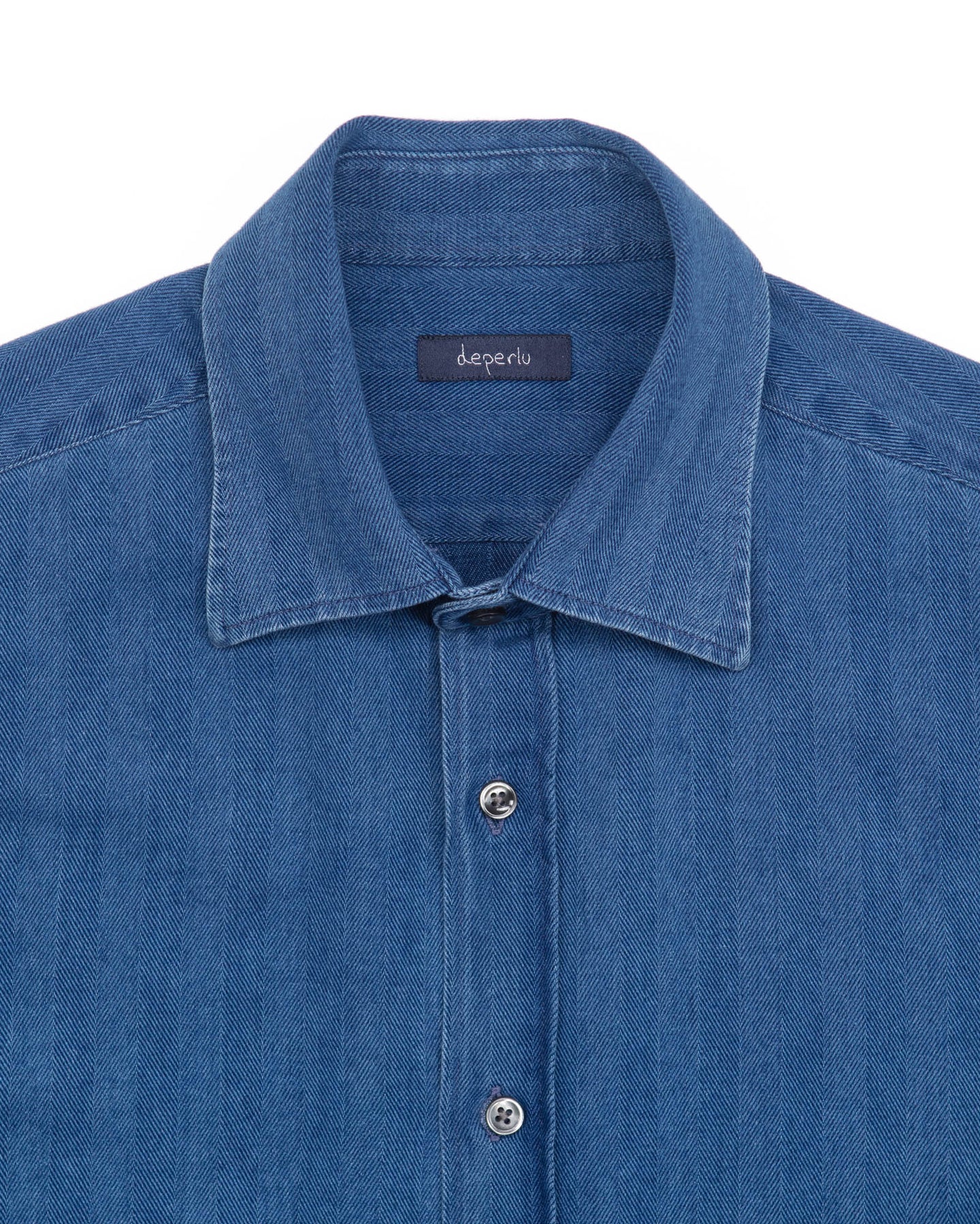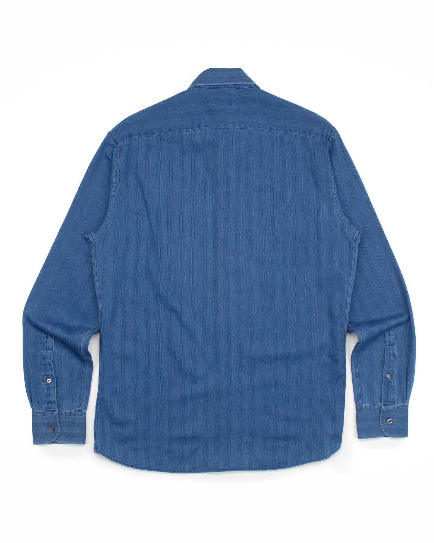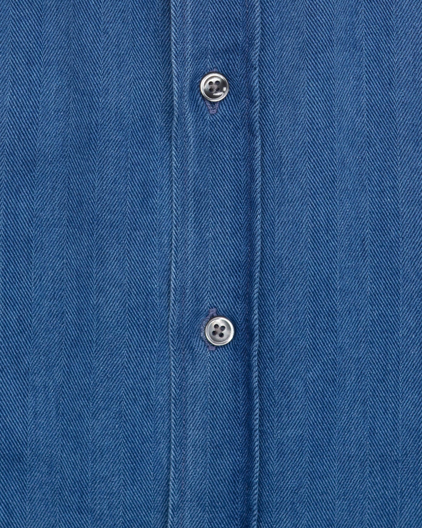 A lightly brushed cotton shirt in a light indigo herringbone fabric. Clean lines with a super interesting fabric and colour.