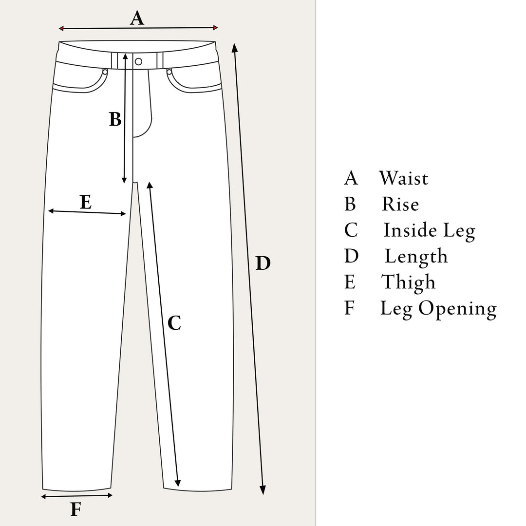 B. Rise Measure from wait above button down to where the two leg seams meet