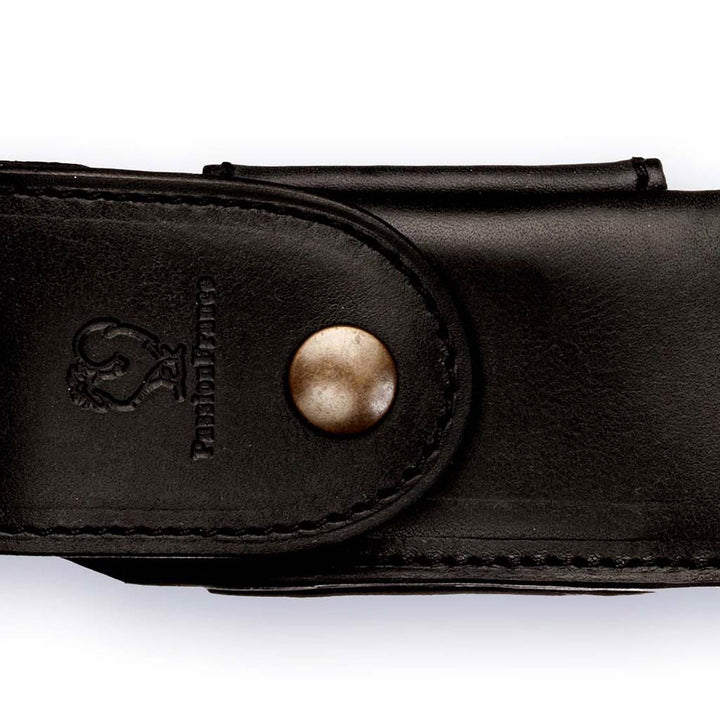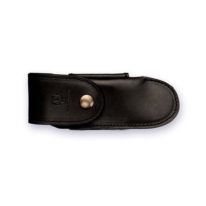 Handmade in France belt sheath for folded knives in black calfskin leather.  The sheath measures 15x4cm and is made to fit all knives in our store except the London model.