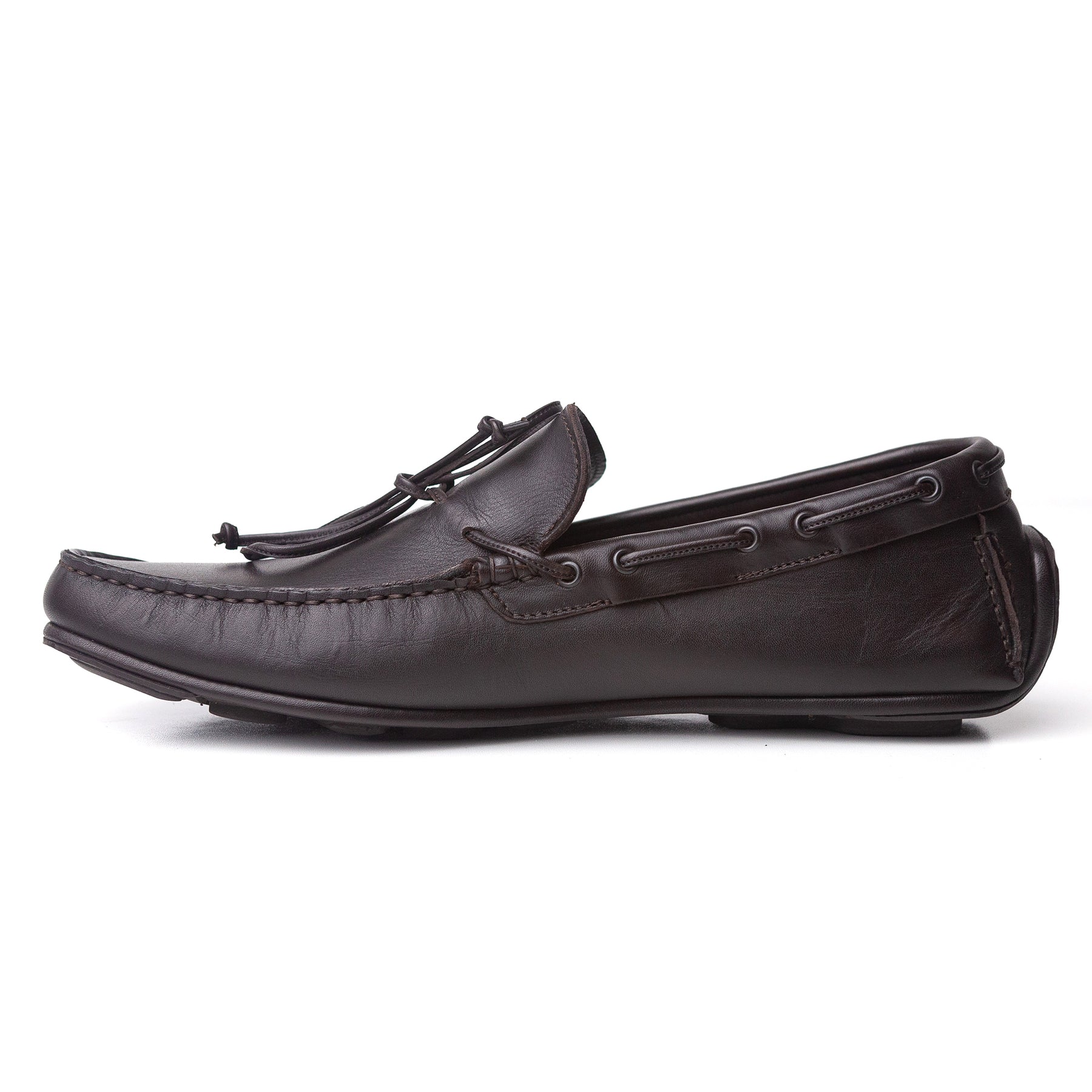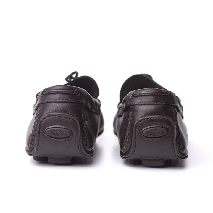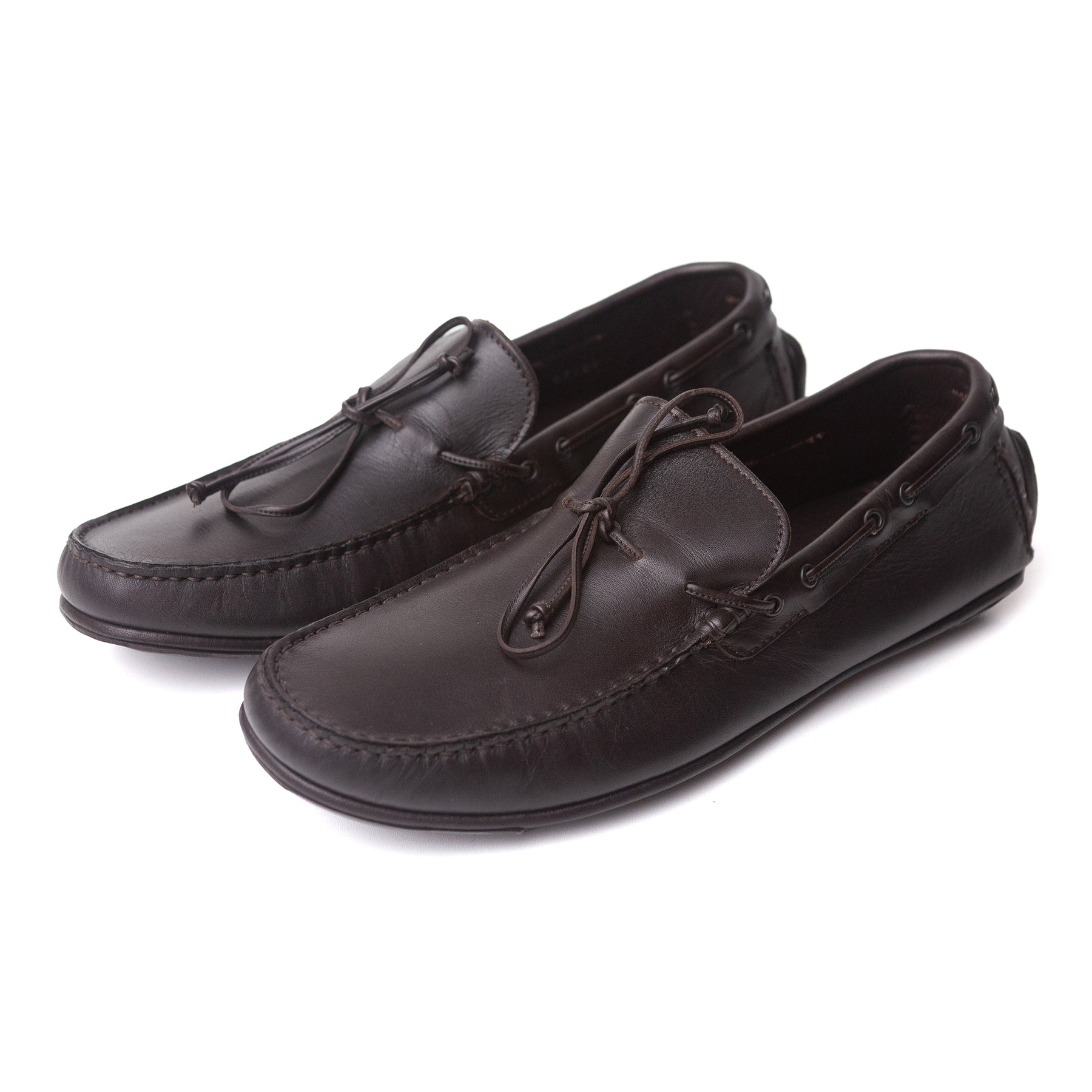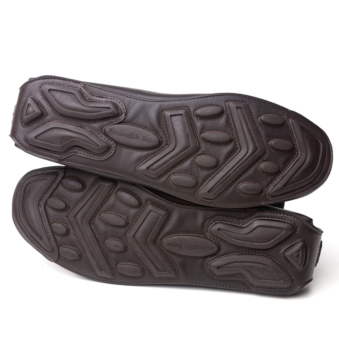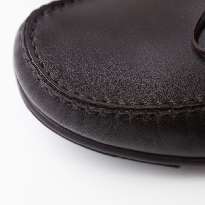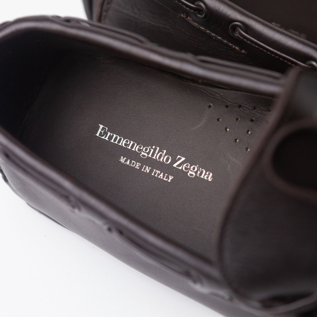 A dark brown leather pair of moccasins from Zegna that are still in amazing condition - perhaps worn a couple of times with some very faint barely visible marks on the side of the toe.