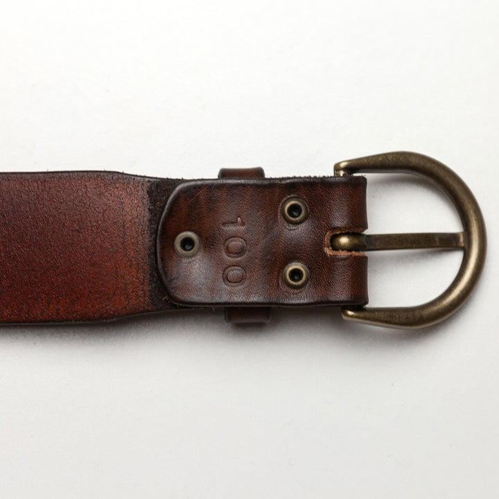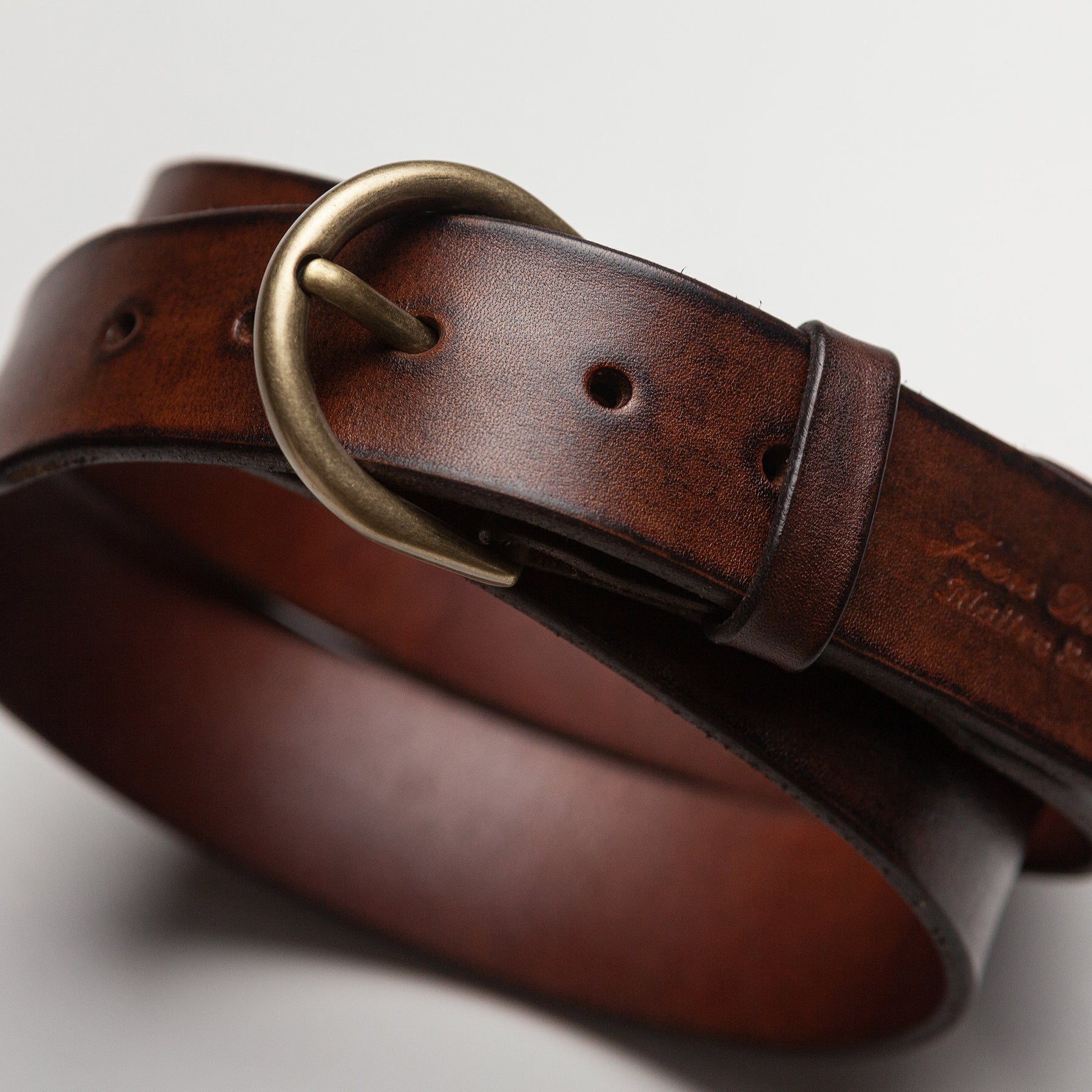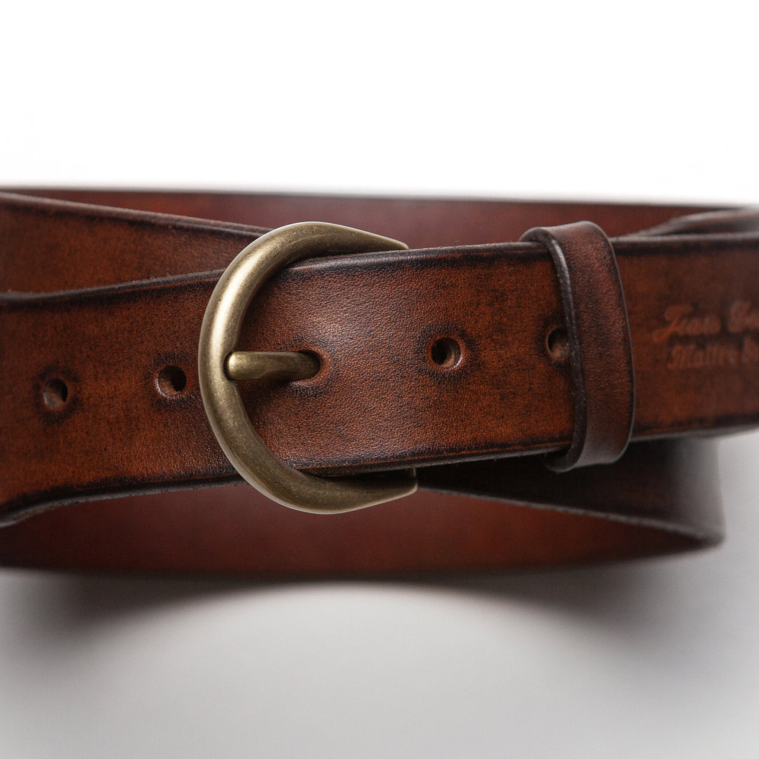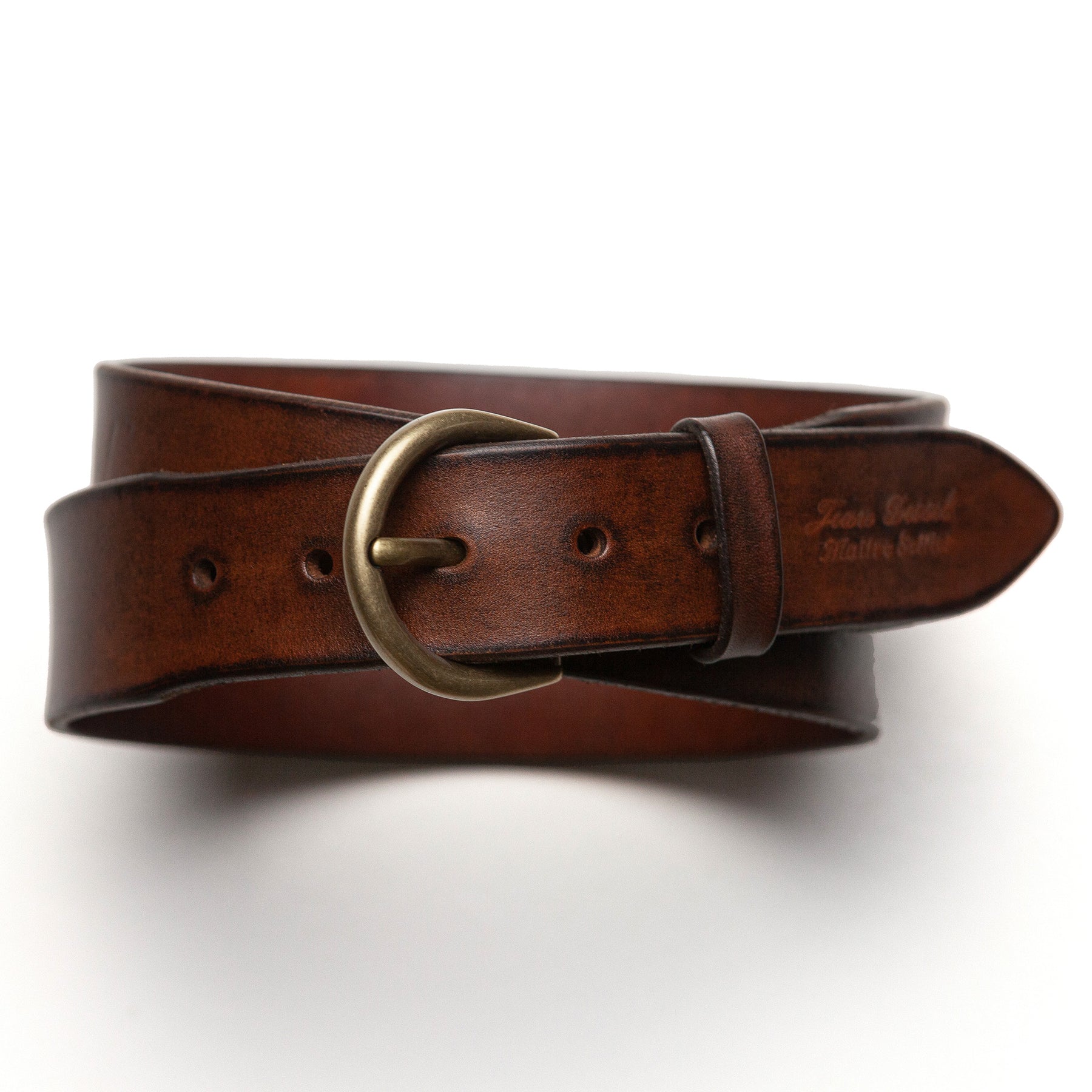 One of the nicest belts we've seen here gentlemen.  The most magnificent antique brown colour, contrasted with the solid brass buckle makes this both a simple classic design, that has touch of the rugged about it too.