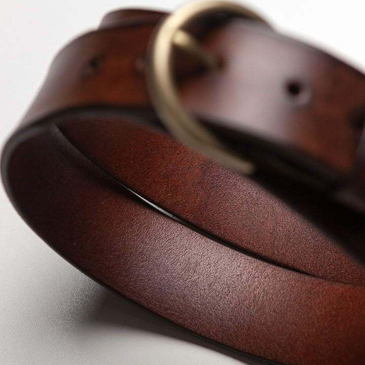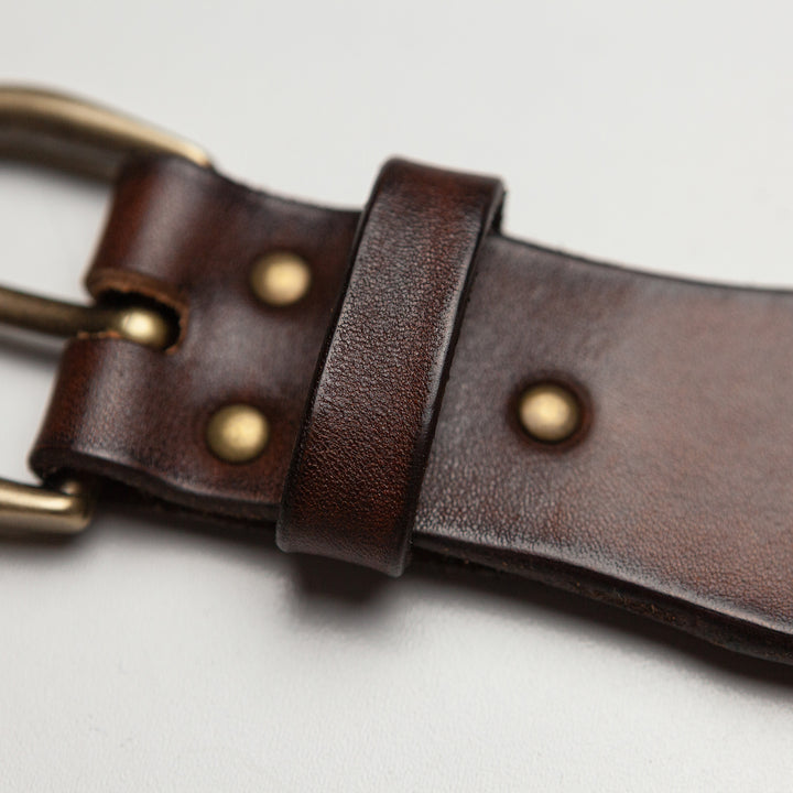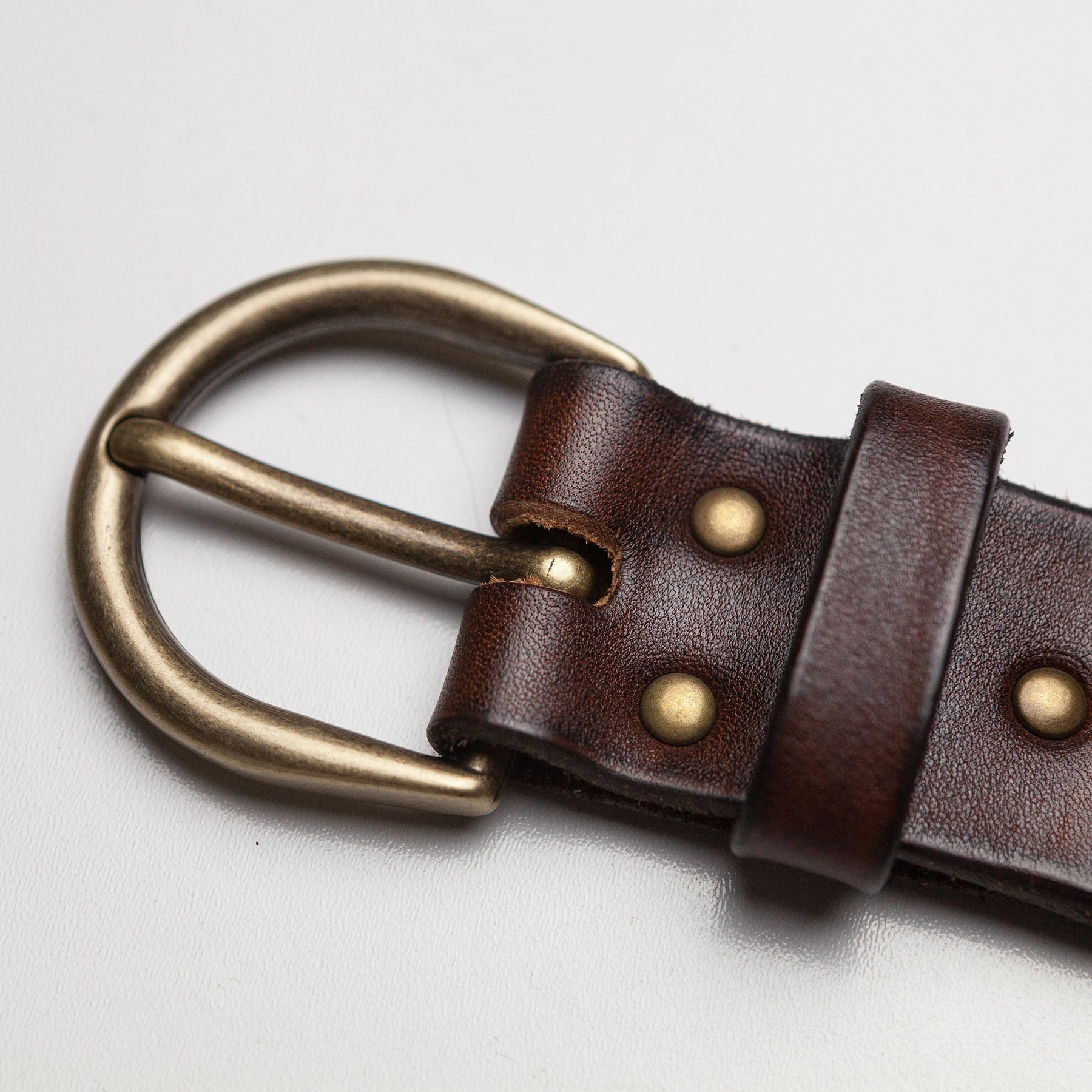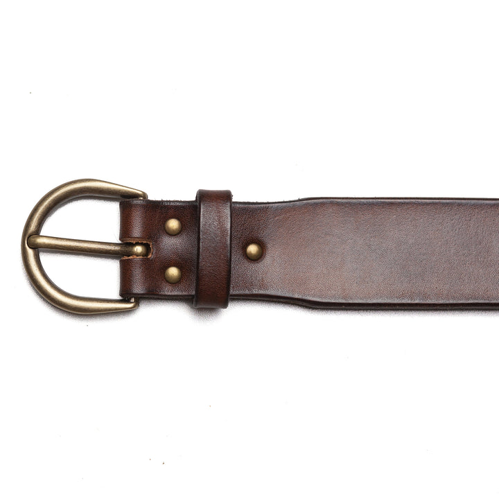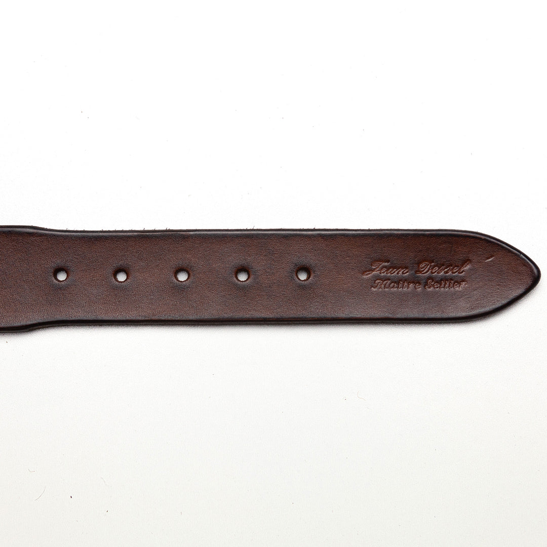 One of the nicest belts we've seen here gentlemen.  The most magnificent antique brown colour, contrasted with the solid brass buckle makes this both a simple classic design, that has touch of the rugged about it too.