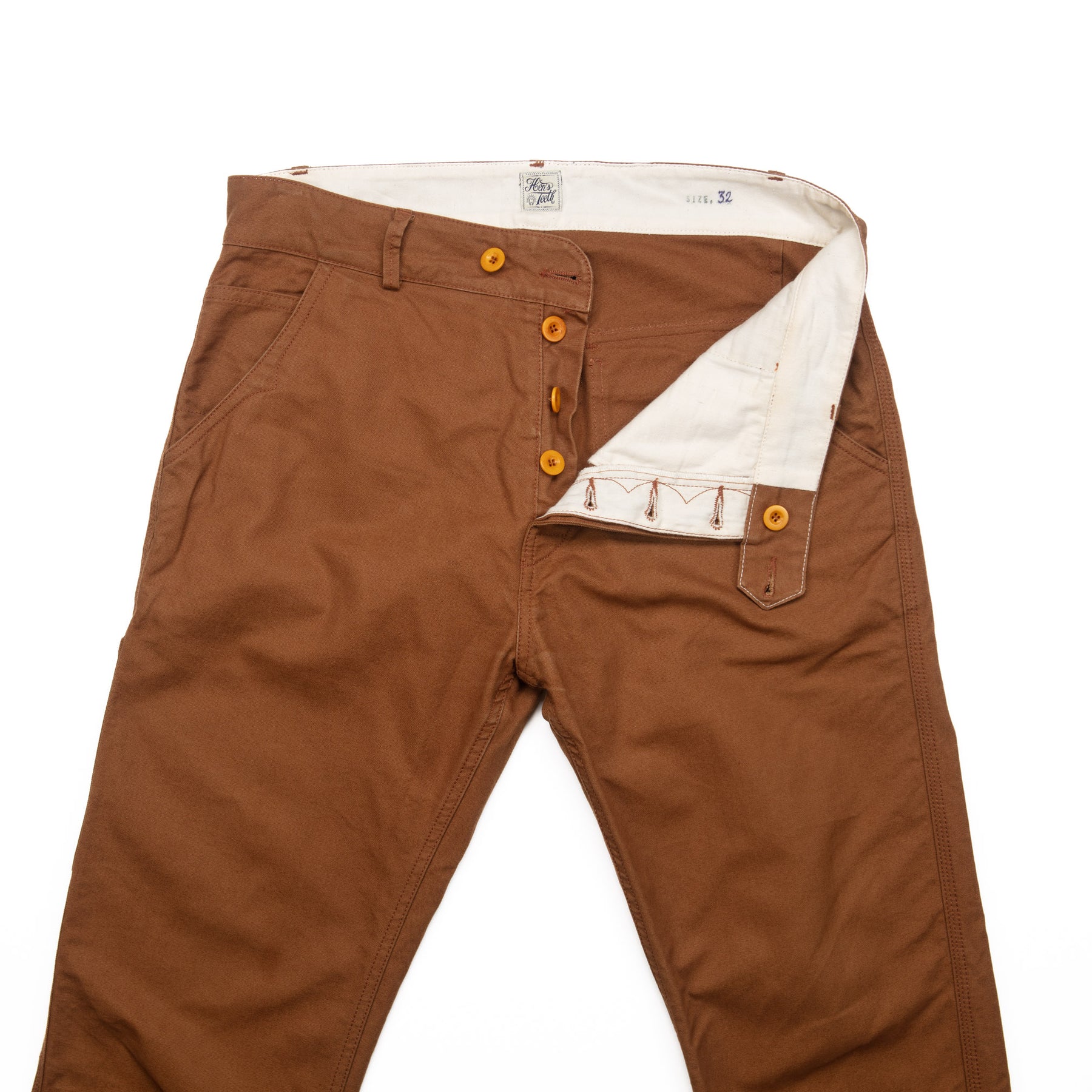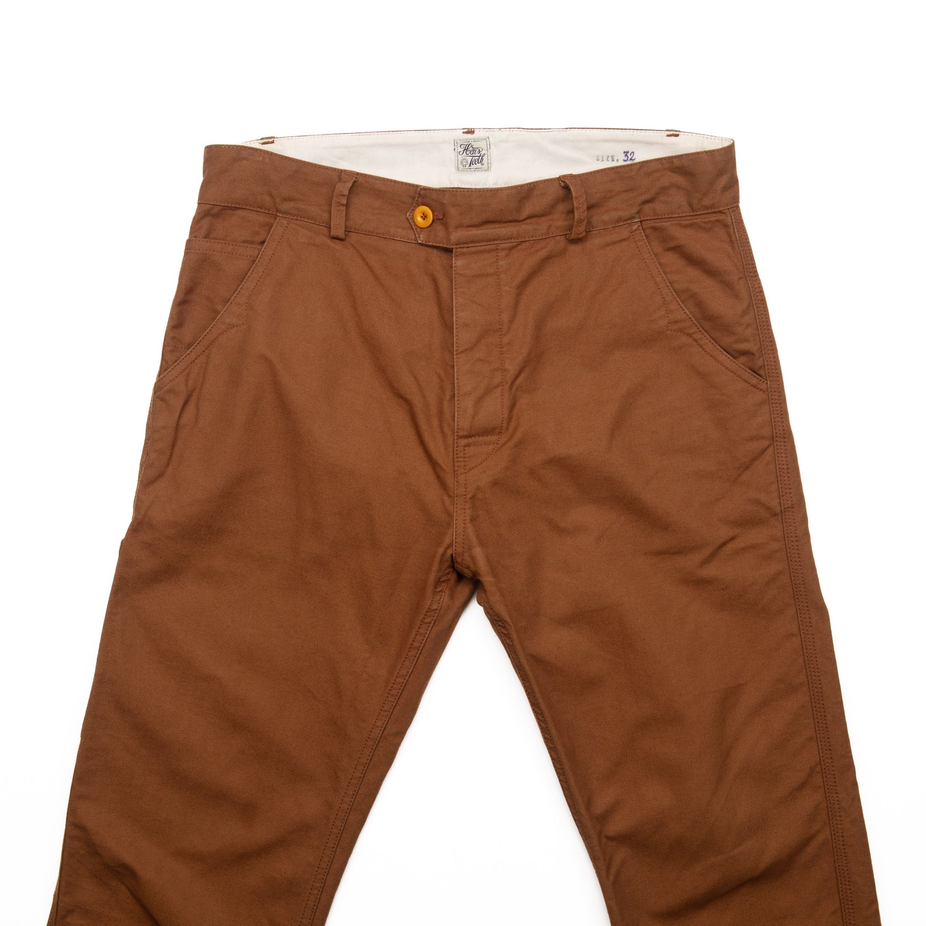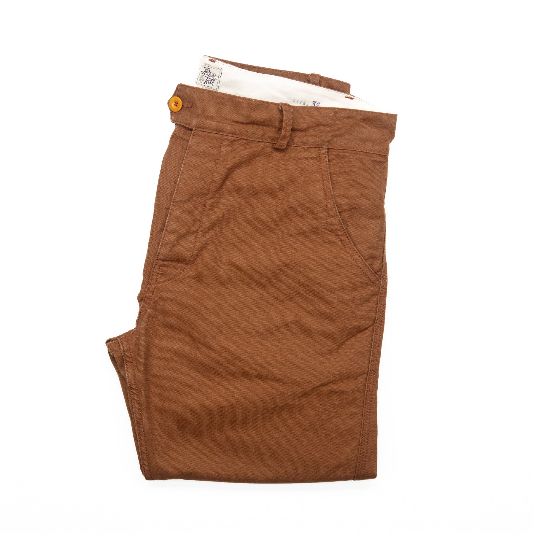 Light wear by the previous owner and in excellent condition.  Duck Canvas chinos in a dark tobacco colour.