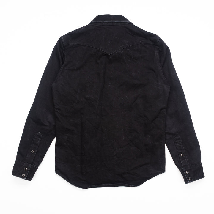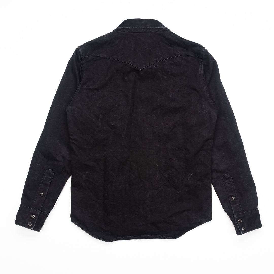A western shirt in black 12oz black denim. The shirt itself is in good condition, with quite a bit of wear - which results in some amazing looking fades.